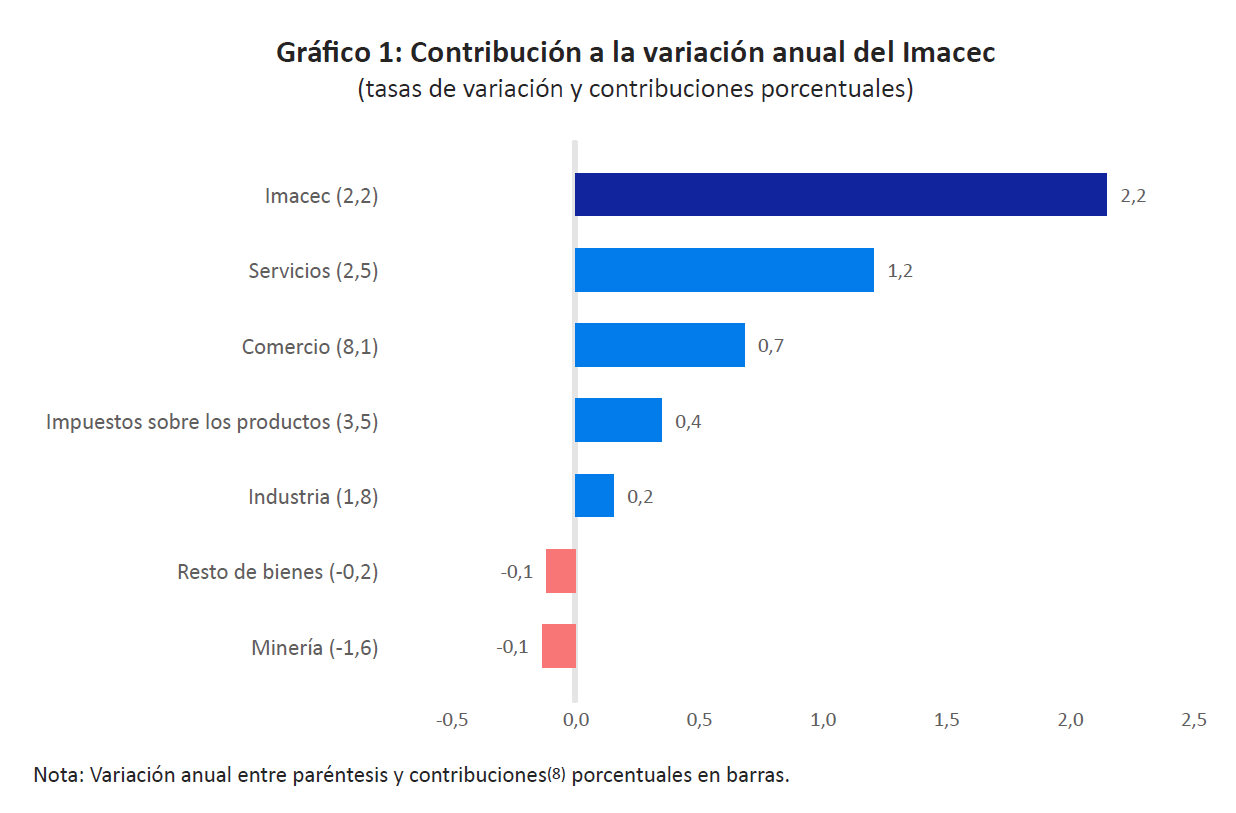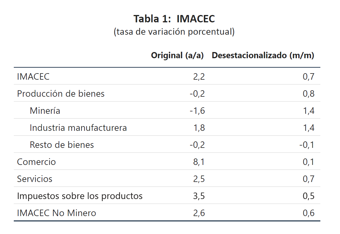 El Imacec no minero presentó un crecimiento anual de 2,6%, mientras que en términos desestacionalizados aumentó 0,6% respecto del mes anterior y 3,0% en doce meses.