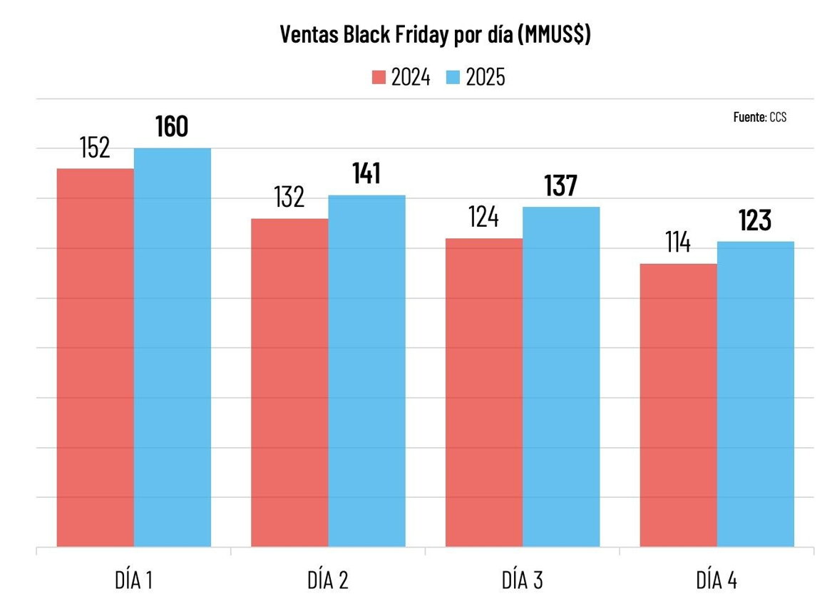 De acuerdo a estimaciones preliminares de la Cámara de Comercio de Santiago (CCS), las ventas totales del Black Friday 2025 superaron levemente los US$ 560 millones, producto de 10,5 millones de compras realizadas por los consumidores tanto en sitios de Internet como en tiendas físicas.