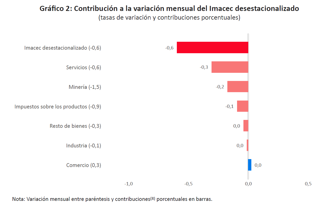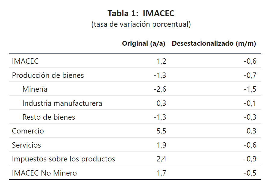 El resultado del Imacec se explicó por el crecimiento de los servicios y el comercio, lo que fue en parte compensado por la menor producción de la minería y del resto de bienes. En tanto, la caída del Imacec en términos desestacionalizados fue determinada por los servicios y la minería.