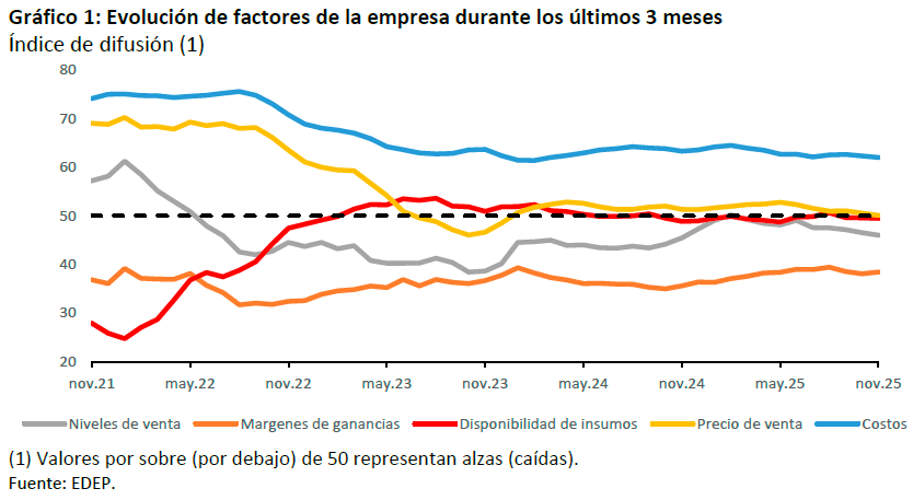 La evolución de los factores de las empresas muestra un escenario en que los precios de venta se mantienen sin variaciones en los últimos meses, en torno a la zona de neutralidad. La percepción de aumento de costos se mantiene similar a los meses anteriores, mientras que los niveles de venta muestran una leve reducción. Por otro lado, los márgenes de ganancia exhiben una leve mejora en el último trimestre móvil.