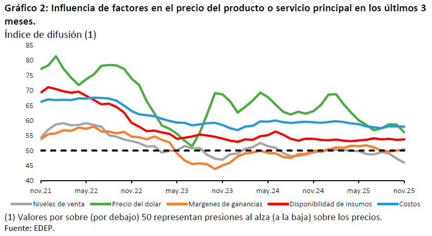 En cuanto a la influencia de distintos factores sobre los precios de venta de los bienes y servicios ofrecidos por las empresas, la encuesta indica que los niveles de ventas ejercen una presión a la baja en los precios. En cambio, los costos y el precio del dólar mantienen la presión al alza en los mismos, con una intensidad similar en el caso de los costos y con una marcada reducción en el caso del tipo de cambio. Por otro lado, los márgenes de ganancias se mantienen sin generar presiones.
