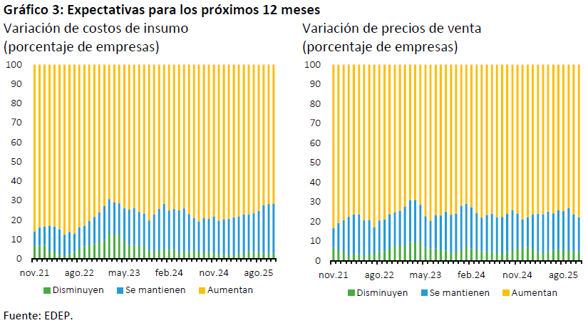En el ámbito de las expectativas, se mantiene el porcentaje de empresas que espera un aumento en los costos de sus insumos, mientras que aquellas que esperan subir sus precios de venta en 12 meses más aumentan levemente¹ .
