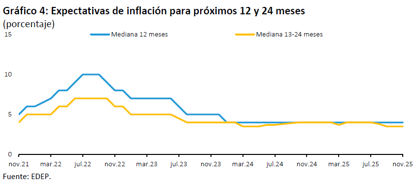 Las medianas de las expectativas de inflación de las empresas para los próximos 12 y 24 meses se mantienen en 4% y 3,5% respectivamente.