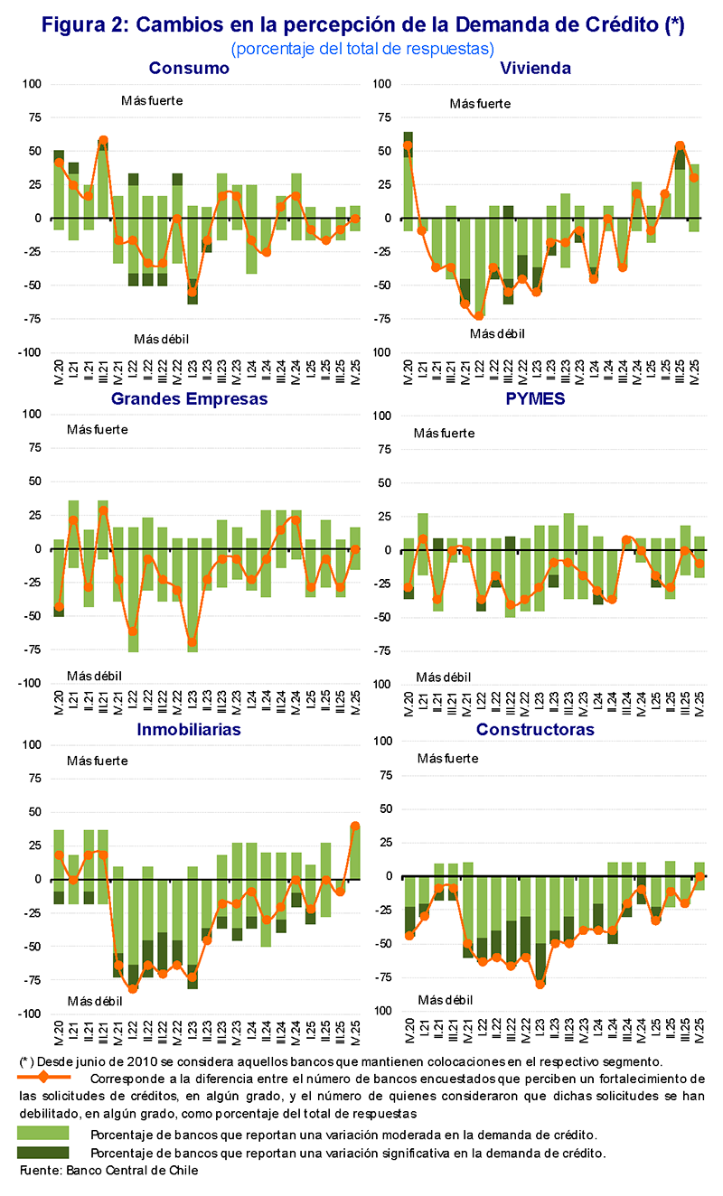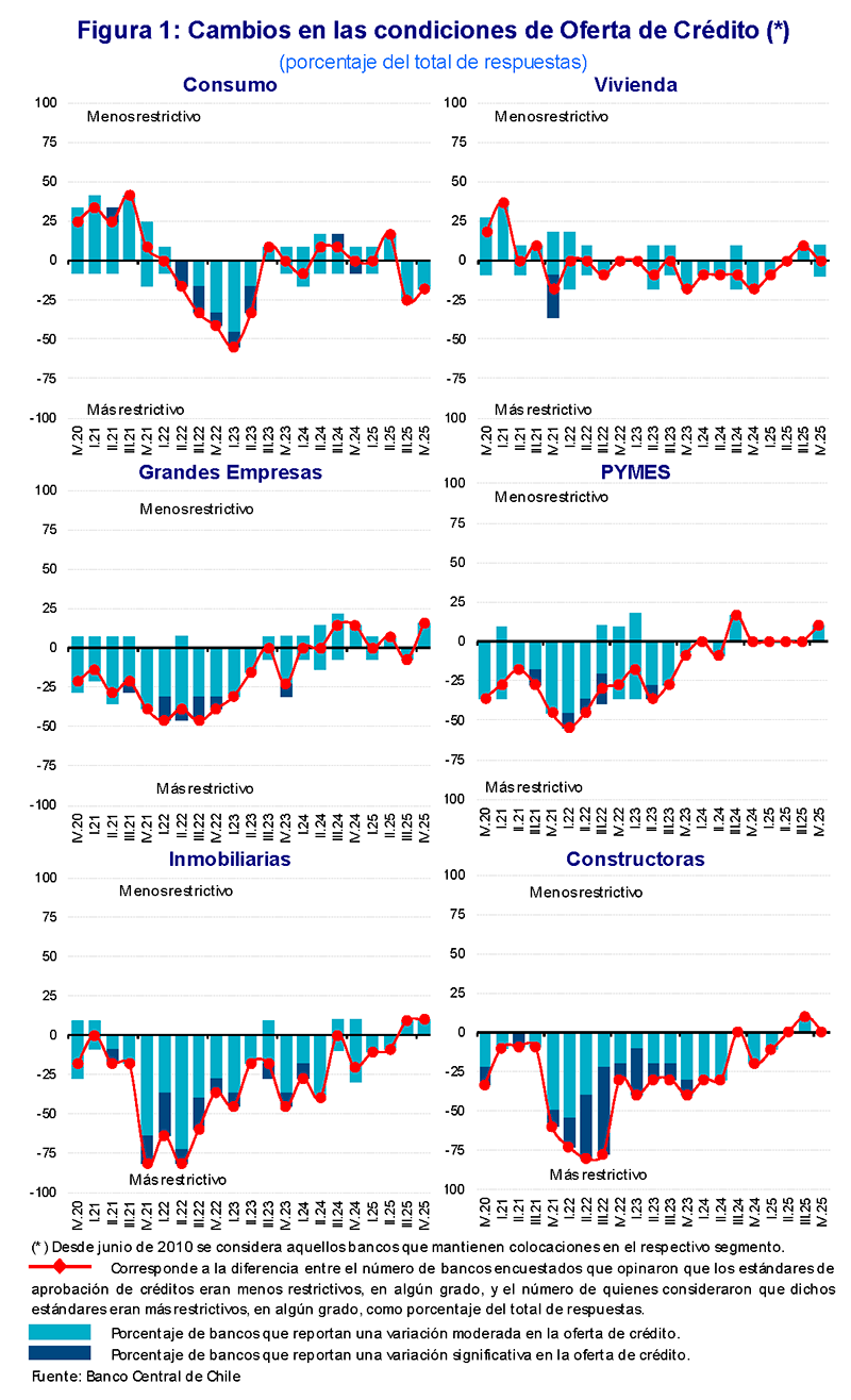 Esta encuesta fue elaborada a partir del levantamiento de las respuestas de los bancos entre el 17 de diciembre de 2025 y 2 de enero de 2026, y tiene por objeto dar a conocer la percepción acerca de los cambios en los estándares de aprobación de nuevos créditos y en la demanda por financiamiento bancario durante el trimestre para el cual se realiza la medición. La encuesta es contestada por los ejecutivos responsables de las áreas de crédito de las instituciones bancarias en Chile. Así, los resultados permiten obtener antecedentes con el fin de comprender mejor los factores económicos y financieros que explican la evolución del comportamiento del crédito. Los datos de la Encuesta de Crédito Bancario se encuentran disponibles en la Base de Datos Estadísticos (BDE) del Banco Central. Para más información respecto al cuestionario con las preguntas de la encuesta y las cifras de los resultados agregados para el período 2003-2025, así como la metodología empleada, visitar la página web del Banco Central de Chile.