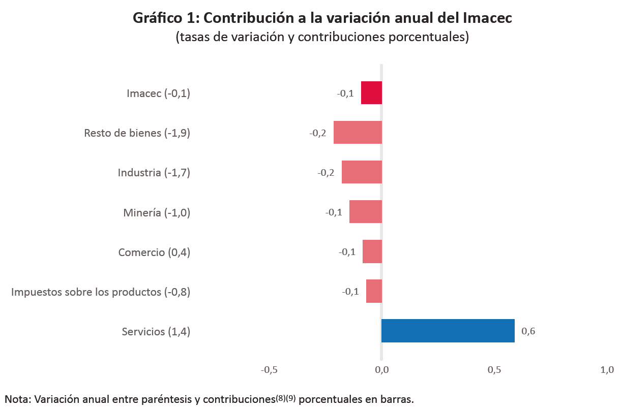 El ente emisor apuntó que el resultado del Imacec se explicó por la caída de la producción de bienes, lo que fue compensado en parte por el desempeño de los servicios. Estos últimos, en tanto, impulsaron el resultado del Imacec en términos desestacionalizados.