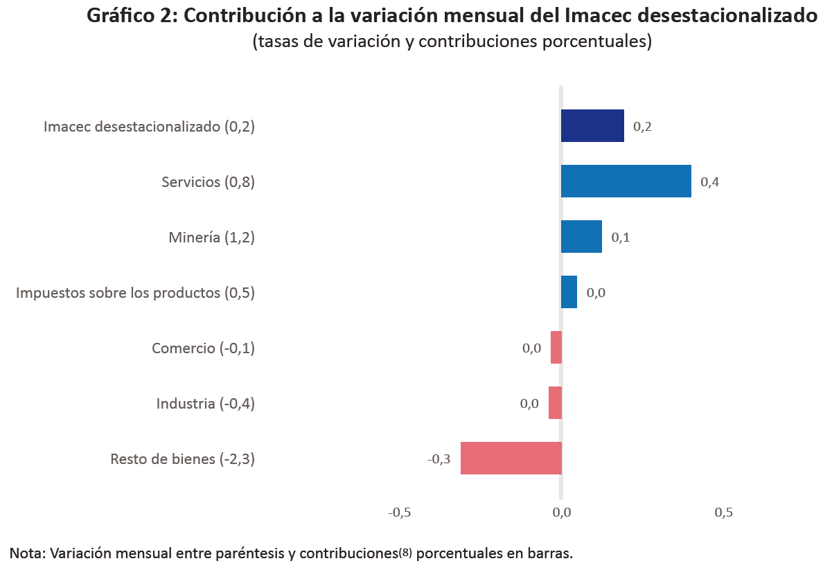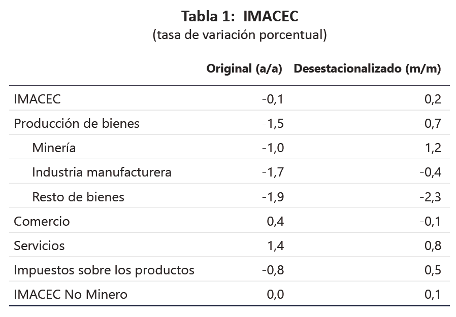 El Imacec no minero no presentó variación anual, mientras que en términos desestacionalizados creció 0,1% respecto del mes anterior y 0,7% en doce meses.