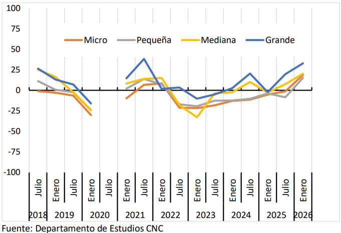 Por subsectores, la mejora es generalizada, aunque con distinta intensidad. Los rubros de mayor escala lideran el optimismo, mientras que aquellos más rezagados durante 2024 y 2025 muestran ahora un repunte significativo en sus perspectivas. Del mismo modo, por tamaño de empresa, todas las categorías retornan a terreno positivo, aunque las grandes combinan una mejor evaluación actual con expectativas sólidas, mientras que en micro y pequeñas el repunte descansa principalmente en la proyección futura.