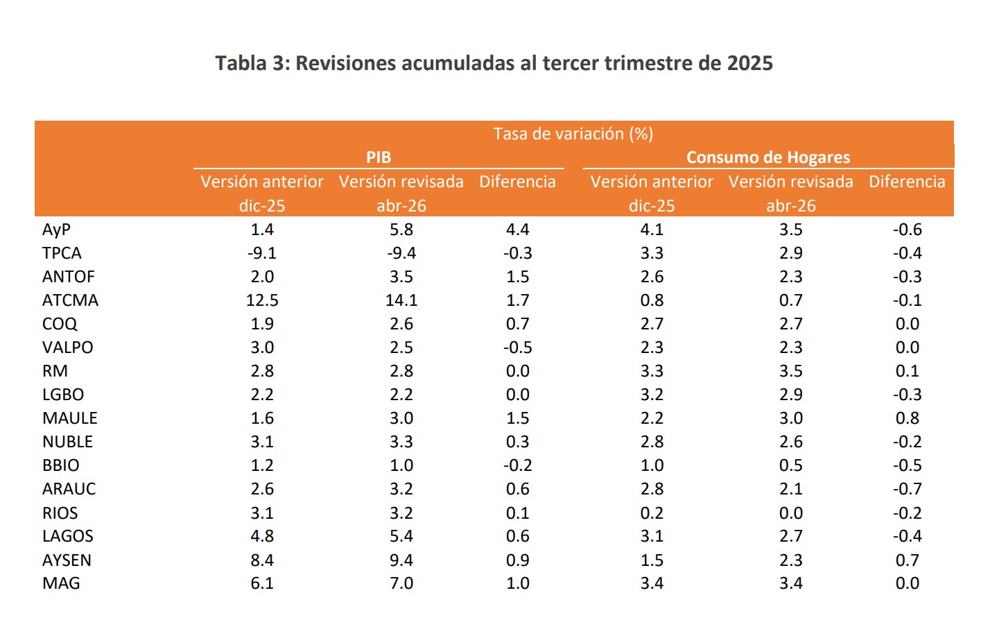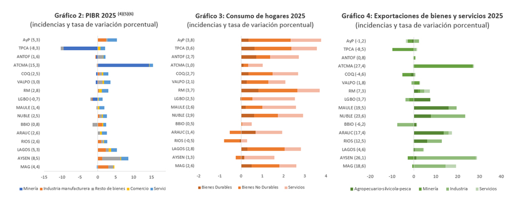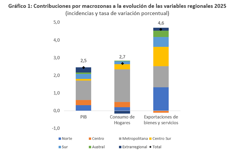 De acuerdo con la información preliminar de las Cuentas Nacionales, entregada hoy por el Banco Central, durante el año 2025 el Producto Interno Bruto (PIB) creció en catorce de las dieciséis regiones del país, aportando a la expansión de 2,5% de la economía nacional. Por su parte, el consumo de los hogares aumentó en quince regiones, registrando una variación agregada de 2,7% en el país. Finalmente, las exportaciones de bienes y servicios anotaron un incremento de 4,6%, con alzas en doce regiones.