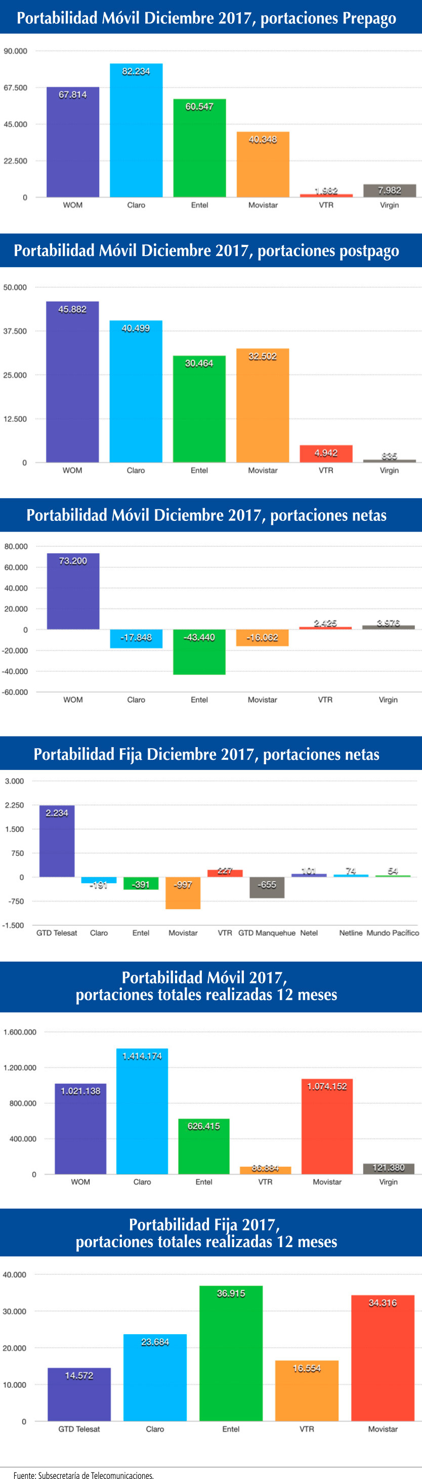 Lo anterior confirma la tendencia que se ha dado en los últimos meses, lo que se refleja en que la tasa de portabilidad total de 2017 fue de 17,7%, siendo de 19,6% la tasa de portabilidad móvil, y de 4,4% la tasa de portabilidad fija.