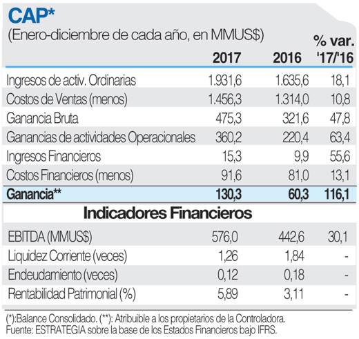 Un resultado neto consolidado de US$ 130,3 millones obtuvo el Grupo CAP en 2017, lo que equivale a más del doble de la cifra registrada como utilidad neta el año 2016.